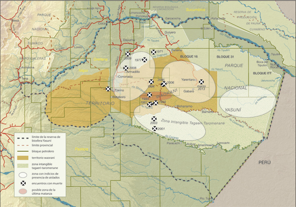 Debe ser intangible el territorio en el que los tagaeri-taromenani habitan. Eso dice la constitución. No el que nosotros creamos que es su territorio, o el que nos conviene que sea. El límite de la zona intangible es, curiosamente, el de los bloques petroleros; es decir, se dejó como intangible lo que le sobró al petróleo. Y ellos, resulta que no estaban solo ahí. En cualquier caso, una zona intangible implicaba controlar los comportamientos de todos quienes están alrededor de estos pueblos e incluso de quienes comparten su territorio, para no afectar sus derechos ni poner en riesgo su vida.