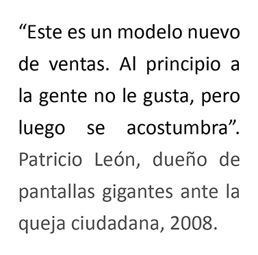 Otra vez: lo que hemos hecho es tomar una tecnología desarrollada en otros países para ser utilizada en autopistas —anuncios para ser vistos a gran distancia, a alta velocidad— y la hemos transplantado a los centros urbanos, acomodándola en el jardín del vecino. A nadie le pareció inapropiado. Tres o cuatro empresas con buenas conexiones en los municipios del país se han repartido el paisaje y libran una encarnizada batalla por nuestra atención. Bajo el membrete de “publicidad innovadora”, cada anuncio empieza a parecerse a un carrusel de feria; si no brilla y hace cabriolas, ya no logra afectar nuestros entumecidos sentidos. Y la escasez de anunciantes que trajo la crisis no ha disminuido la contaminación visual, sino que se multiplican los avisos de “espacio disponible” o los esqueletos vacíos y desvencijados de estos cíclopes, guardando puesto.