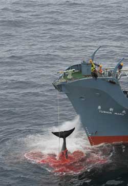 | La flota ballenera japonesa partió una vez más, en noviembre de 2006, hacia la Antártida. Compuesta por un buque factoría –el tristemente célebre Nisshin Maru– y cinco buques arponeros, tiene como misión cazar cerca de 935 ballenas minke (Balaenoptera bonaerensis) y 10 ballenas de aleta (B. physalus) en el Santuario Ballenero Austral, que abarca las aguas alrededor del continente helado.