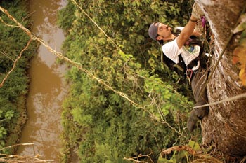 En la provincia de Pastaza, Santiago Molina alcanza la primera horqueta de un imponente Ficus, a unos 35 metros de altura. La altura de estos árboles se acerca a los 50 metros de altura, pero no es necesario llegar tan alto para disfrutar de la extensa Amazonía. o del estero que discurre abajo uniendo una laguna de várzea con el río Capahuari. |