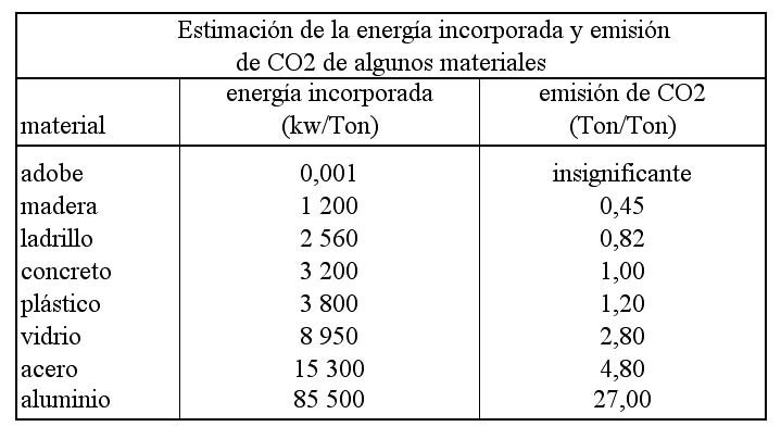El examen de la energía incorporada en el ciclo de vida del acero, por ejemplo, evidencia que para producir una tonelada de este material se necesitan 15 mil kilovatios de electricidad, que al provenir de combustibles fósiles, emiten 4,7 toneladas de dióxido de carbono. De la misma forma, una tonelada de cemento tiene 3 200 kilovatios de energía incorporada que, como en Ecuador la mitad de la energía proviene de combustibles fósiles, contribuye con una tonelada de dióxido de carbono al calentamiento global. Es decir, la producción de cemento produce su propio peso en contaminación con dióxido de carbono (ver cuadro).