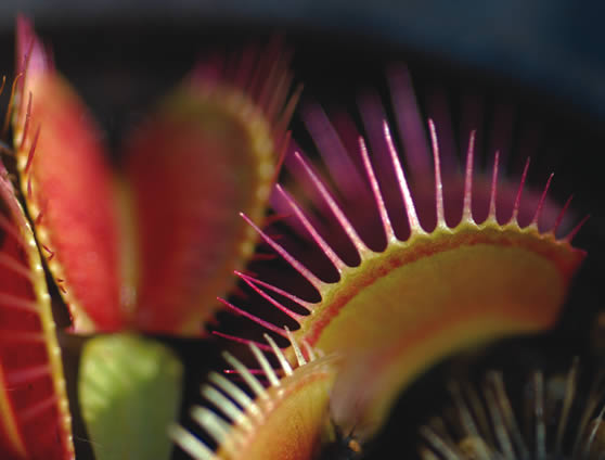 2. Las que emplean “cepos” o “ratoneras” (snap traps). Con solo dos especies, una terrestre y una acuática, no son tan diversas como los embudos, aunque cuentan con la especie más popular, la famosa venus atrapamoscas. En este caso, la trampa está formada por hojas cuyas secciones terminales están divididas en dos lóbulos articulados. En la cara interna de estos lóbulos hay pequeños filamentos sensibles al tacto que una vez activados provocan un cambio rápido en la forma de las células de la articulación, lo que a su vez cierra rápidamente la trampa, atrapando una gran variedad de presas, que son absorbidas tras una digestión de varios días.