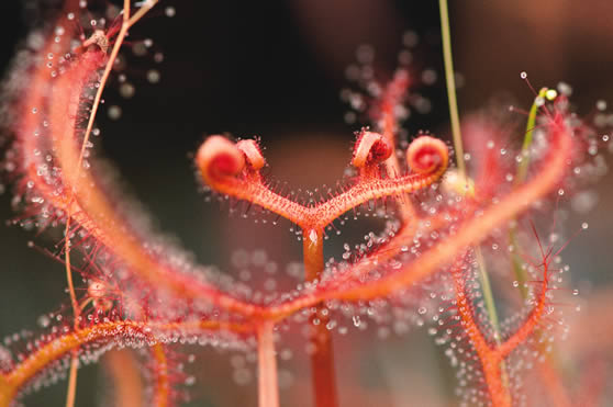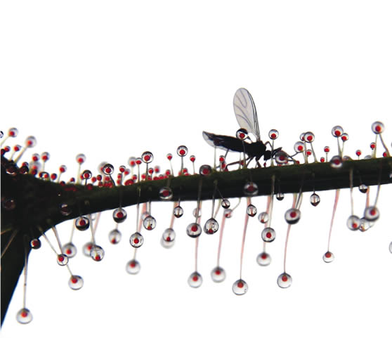 3. Las plantas que presentan hojas que secretan fluidos viscosos y pegajosos parecidos al del papel atrapamoscas (flypaper traps), aunque de aroma dulce, que atrae a pequeños insectos. En este grupo se encuentran las especies presentes en el Ecuador. En las plantas llamadas rocío de sol, del género Drosera, las glándulas pegajosas se encuentran en el extremo de tentáculos que reaccionan moviéndose hasta envolver a la presa. El otro género de este grupo presente en nuestro país es Pinguicola. En estas plantas, las glándulas que secretan las sustancias pegajosas son pequeñas y no son móviles; sin embargo, la hoja misma se puede envolver o desarrollar una pequeña cavidad donde la presa es digerida.