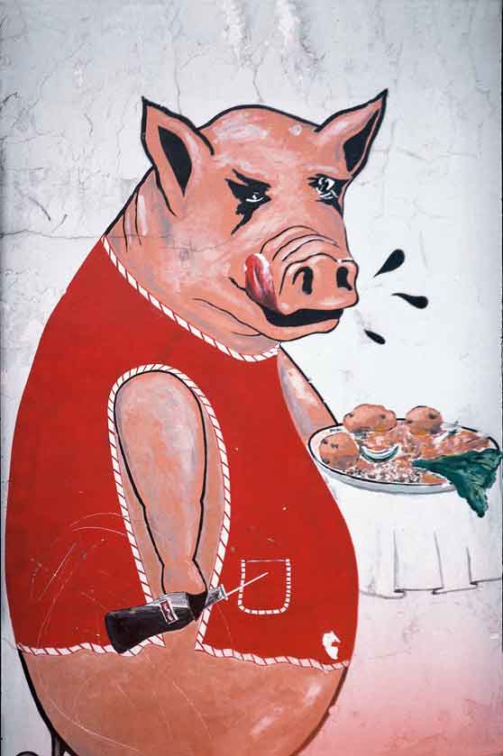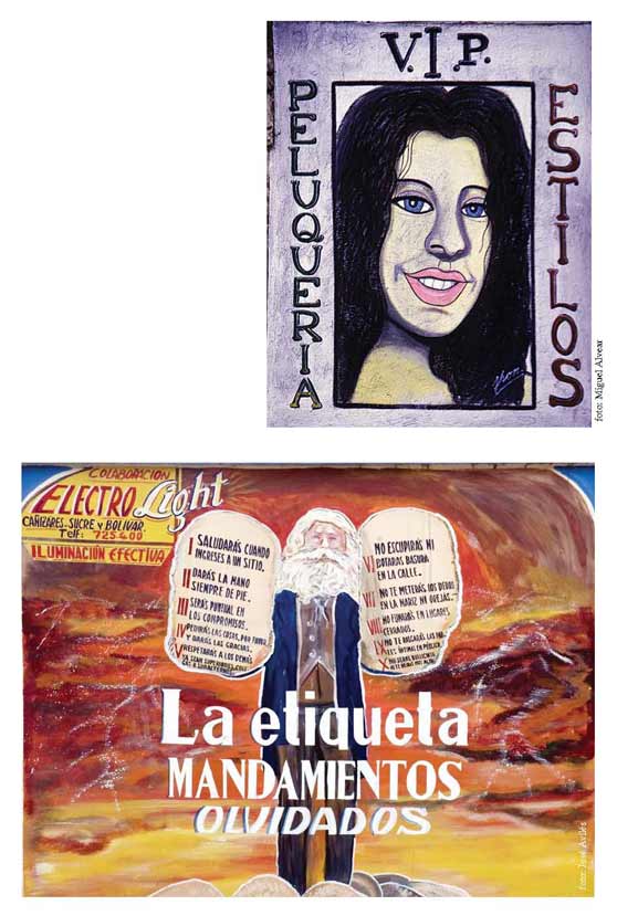 , comedores o cabarets, propagandas políticas que hacen ver bellos a los partidos por una sola vez, y tipografías múltiples, revelan una forma de producción que iba del concepto a la realización manual de la idea por parte de un ejército de obreros gráficos y su plasmación en el espacio público o la propiedad privada. Aunque muchas de las imágenes atrapadas en estas páginas hoy por hoy hayan dejado de existir, encontrarán su revancha en la magia simpática que todavía puedan despertar en los lectores. De hecho, este poder mágico se reserva normalmente a aquellas alusivas a figuras religiosas, alguna también aquí incluida. Sin embargo, la calidad de ruinas en el presente que guarda el resto promueve a pensar en las obtusas transformaciones que, muchas veces, tienen lugar en nombre del progreso. Así, estas imágenes adquieren el poder renovado que, como contraparte a su marginación, adquieren todas las imágenes del pasado. Detrás de algunos de estos letreros hay formas de vida y sectores sociales que han sido empujados a los márgenes de la ciudad, y con ello formas estéticas que nunca llegaron a formar parte de los cánones aceptados del arte, amén de aquellos hacedores de imágenes que, trabajando por comisión, se encargaron de dejar un testimonio de sus propios criterios y talentos en las paredes de negocios particulares. Con la salvedad de las transnacionales de gaseosas y algunas instituciones públicas, fue y es precisamente el patronazgo de los pequeños o medianos comerciantes, y, por ejemplo, los sentidos de distinción del ciudadano común intentando decorar su automóvil para convertirlo en un museo itinerante, los que han dejado esta particularmente rica impronta esparcida por todo espacio que no haya sido aún “regenerado”. Esta muestra intenta honrar el legado de hacedores y financistas anónimos, aquellos que gozaron del prestigio otorgado por estas imágenes en el día a día de las que una vez fueron sus calles