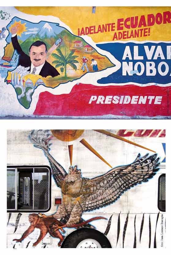 caso sea lo anodino en que se está convirtiendo el panorama visual en las ciudades ecuatorianas que haya desatado el sentido de urgencia que encierra la publicación de estas imágenes. Ellas han sido seleccionadas de una muestra más amplia, captada por las lentes de un colectivo dispar y nucleada por la convocatoria de Juan Lorenzo Barragán. Necesariamente tienen énfasis diferentes y enmarcan la realidad de distinta manera. Sin embargo, todas ellas tienen en común partir de un sentido de admiración por lo que llamamos “lo popular”, sin esencializarlo ni reducirlo a expresiones materiales desarrolladas fuera de toda influencia o, por el contrario, apegado solamente a la marca étnica de sus hacedores. De hecho, el registro aquí presentado –que fuera desarrollado individualmente por sus autores, a diversos ritmos y en distintos tiempos, y que muchas veces encuentra su territorio común en la reacción de humor e irreverencia frente a los cánones establecidos por los sentidos gráficos dominantes– retrata en su conjunto un legado subestimado por las definiciones patrimoniales del estado: aquel creado por los hacedores de imágenes de estratos populares y, se puede presumir legítimamente, de condición mayormente mestiza, operando desde y sobre entornos urbanos de ciudades de mayor y menor alcance.
