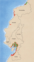 A diferencia de los concheros, cangrejeros, carboneros y pescadores, estos nuevos “usuarios” no precisaban del manglar; al contrario, tenían que deshacerse de él. Así, las imágenes de CLIRSEN indican que para 1991 se habían perdido al menos 41 mil hectáreas de las que habían en 1969. Los últimos datos, de 2006, reportan la existencia de 147 mil hectáreas de manglar, una pérdida de al menos un tercio de la cobertura original, tomando en cuenta los estimados más conservadores. En estuarios puntuales, la situación es más dramática; en Cojimíes se ha perdido el 79% del manglar y en el río Chone el 76% (ver mapa).