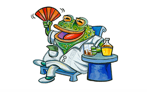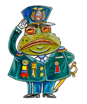 Los sapos militares son casi todos verdes, aunque tienen la panza azul cuando trabajan junto al mar. Son muy creídos: se creen los sapos más honrados, más valientes y más sexis. Hasta tienen jueces propios cuando hacen alguna sapada. De puro saludar llevando la mano derecha extendida a la altura de los ojos es fácil reconocerlos porque tienen las cejas bastante abultadas. Los mejores sapos de esta clase son los de las jerarquías superiores: de coronel a general y de general de brigada a general de ejército. Son muy buenos para el volleyball, juego que requiere de una gran capacidad para el salto alto y los clavados. Cuando se jubilan, se jubilan barrigones. [Como son muy necesarios para librarnos de nuestros enemigos, el autor de esta nota científica no detalla algunas sapadas de los sapos militares.]