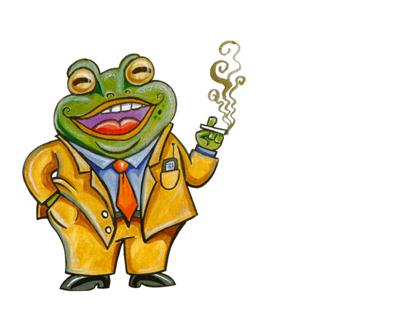 Los sapos empresariales pululan sobre todo en la Costa ecuatoriana. No les gusta competir con otros, evaden el pago del impuesto a la renta y secretan jugos venenosos contra aquellas autoridades que se empeñan en vano en que paguen lo que deben y no se dediquen tanto al contrabando. Es una clase de sapo sumamente generoso con el dinero del estado. Les gusta la franja negra que hace juego con la raya de sus ojos, y tienen alegres borracheras en las playas. Son muy patrióticos con la patria chica, se precian de tener destino marinero y de que la única flor que conocen es la rosa de los vientos. El pasatiempo de estos sapos no era jugar al sapo sino devaluar la moneda. Ahora, con la dolarización, ya no pueden divertirse así. Dicen que por este motivo andan deprimidos. [Por temor al sapo mayor de ellos que anda siempre en guayabera, el autor de esta nota científica no detalla algunas sapadas de los sapos empresariales.]